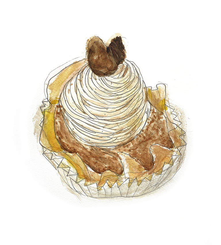 クリームや栗、粉砂糖など微妙な色の違いが描き分けられていて