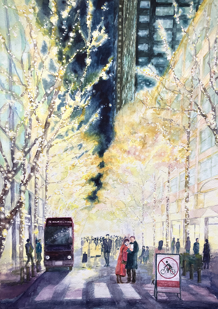 HOME > 会員作品 > 会員作品 絵画クラス作品水彩画「丸の内」 2025年12月15日 Kさんは作品を描くときに毎回一度習作を描いてから本番に臨んでいます。 今回もマスキングや光を表現する絵の具の濃淡などを 入念に練習してから本番を描きました。イルミネーションが煌めく夜の丸の内がキラキラとしていて、 街ゆく人々のこのシーズンを楽しむ気持ちがよくわかります。 透明水彩の透明感を引き出す部分と、 夜空の塗り込みのコントラストがよく効いていて、 街の明るさがとても煌びやかに表現されています。(松隈講師) -会員作品, 絵画クラス作品