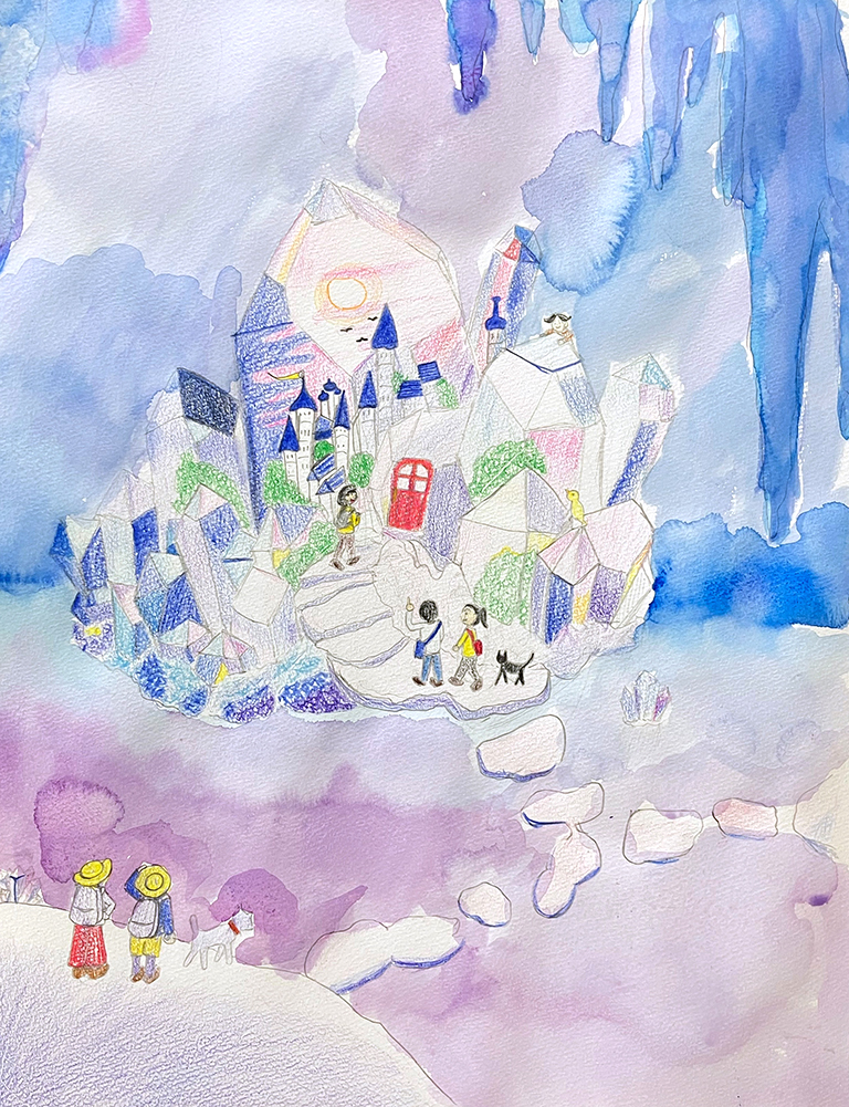 絵の具のにじみや透明感がより幻想的な風景にしています。
