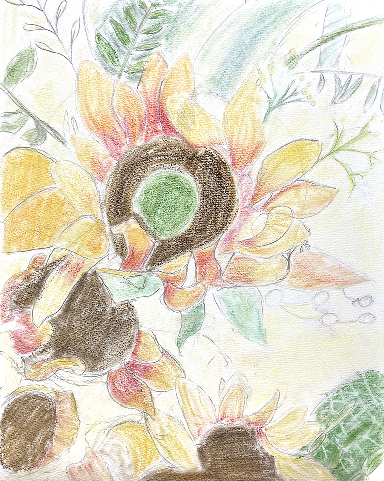 今回のヒマワリは花びらがいろんな方向を向いているところを丁寧に丁寧に描き進めました。